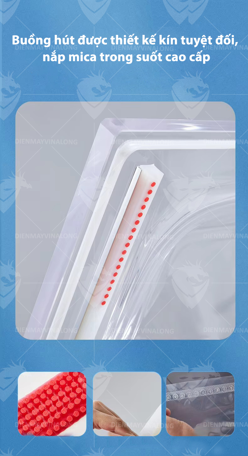 Buồng hút được thiết kế kín tuyệt đối, nắp mica trong suốt cao cấp cho phép người dùng dễ dàng quan sát toàn bộ quá trình hút chân không – đảm bảo an toàn và tiện lợi khi sử dụng.