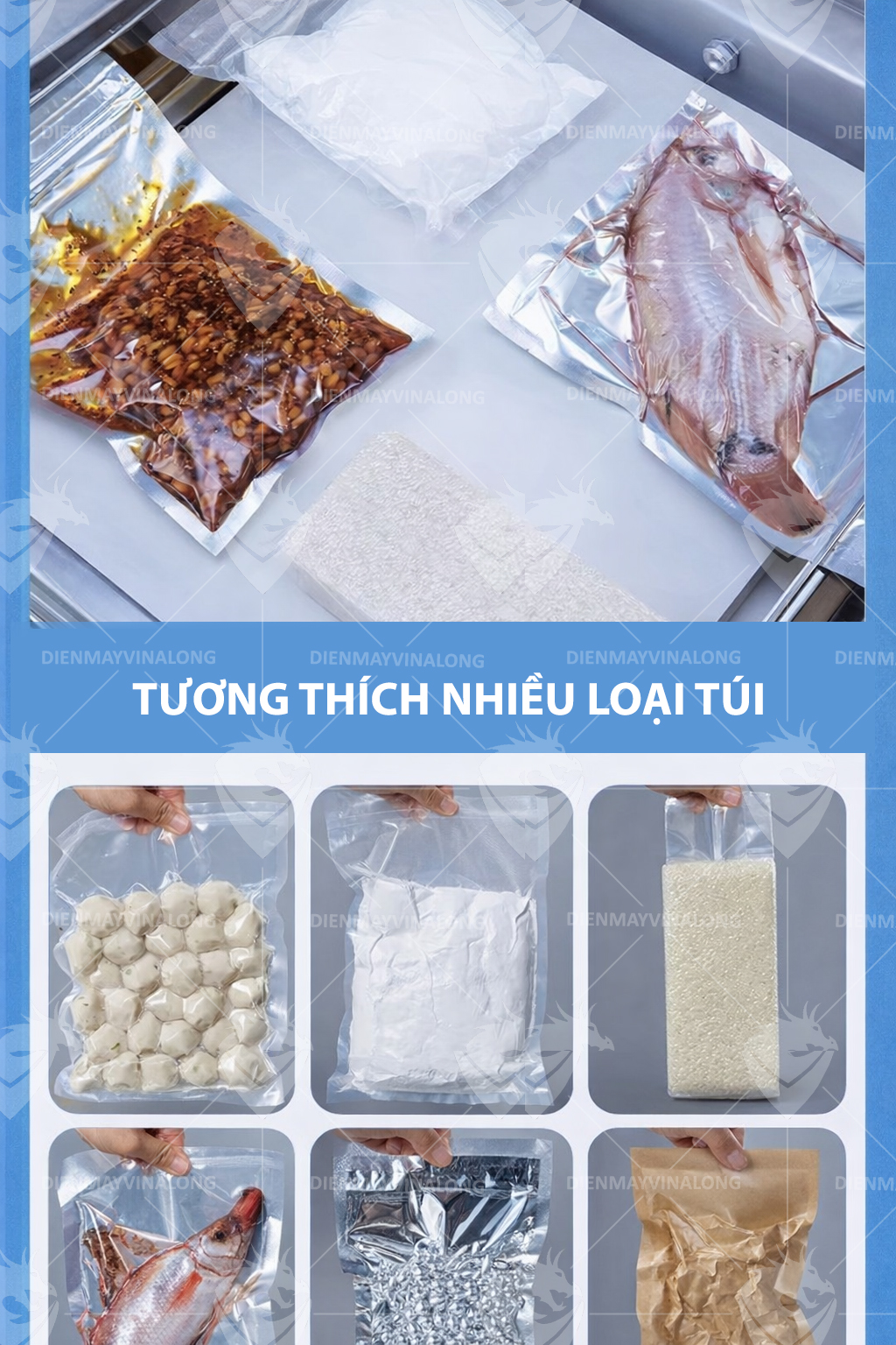 Máy hoạt động tốt với các loại túi PE, PA/PE, túi màng nhôm, túi sinh học, giúp linh hoạt trong mọi nhu cầu đóng gói khác nhau.