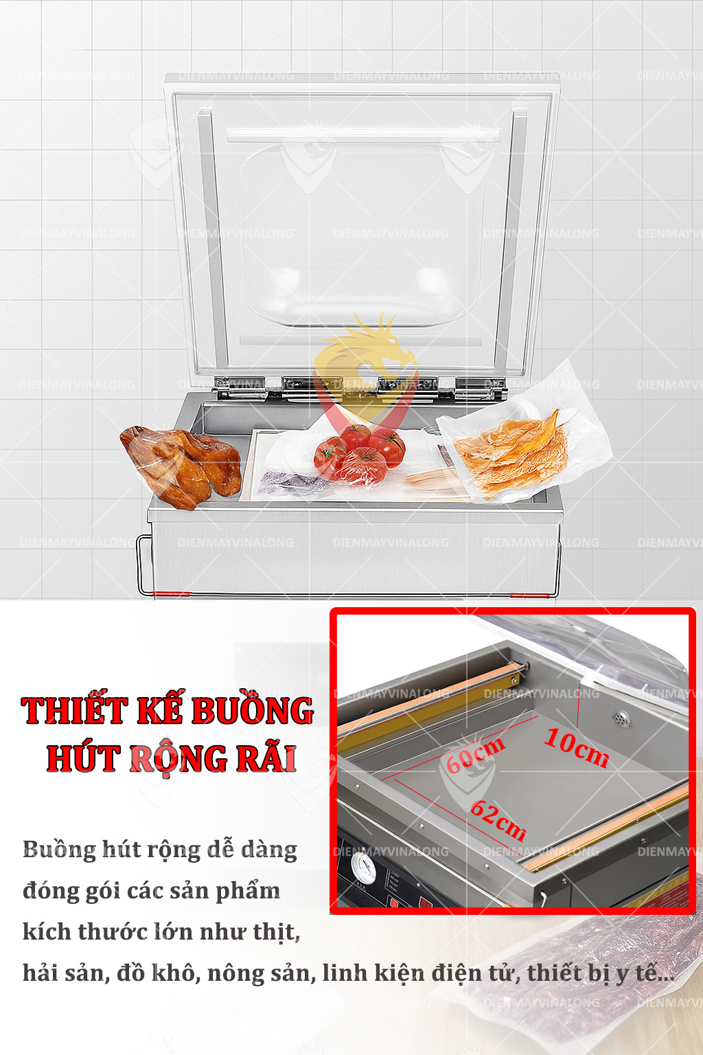 Buồng hút rộng 620mm x 600mm x 100mm, dễ dàng đóng gói các sản phẩm kích thước lớn như thịt, hải sản, đồ khô, nông sản, linh kiện điện tử, thiết bị y tế…