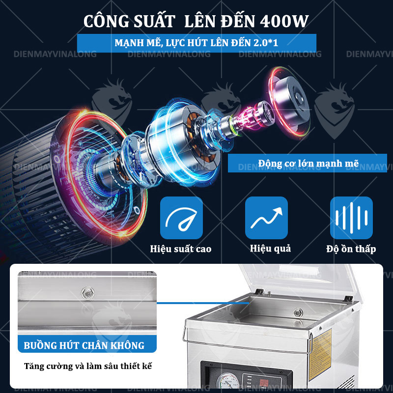 • Công suất hút cực mạnh lên tới 400W, nhờ động cơ chân không công nghệ mới, giúp hút sạch không khí trong túi, tăng độ kín và kéo dài thời gian bảo quản thực phẩm.