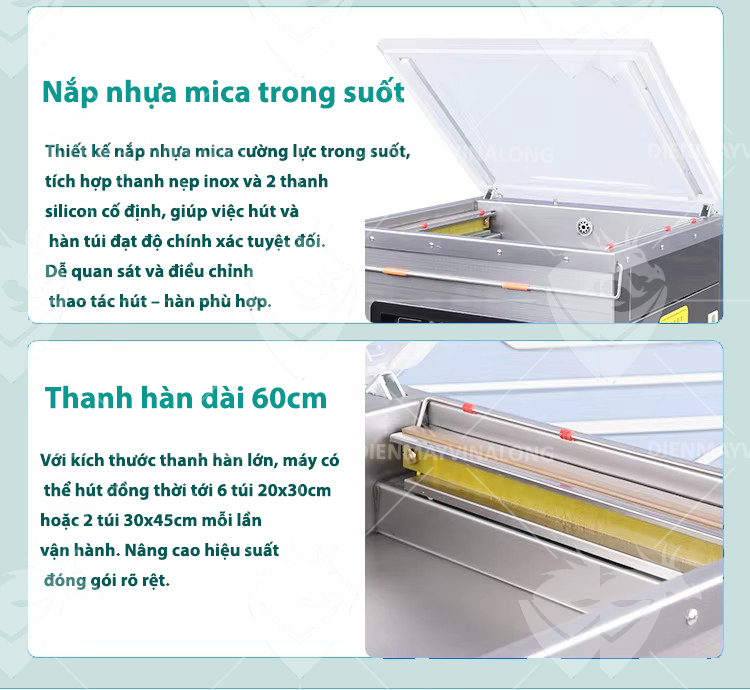 Thiết kế nắp nhựa mica cường lực trong suốt, tích hợp thanh nẹp inox và 2 thanh silicon cố định, giúp việc hút và hàn túi đạt độ chính xác tuyệt đối. Dễ quan sát và điều chỉnh thao tác hút – hàn phù hợp.