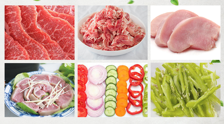 Máy có bộ lưỡi dao sắc bén bằng thép chuyên dụng, cho phép cắt thịt bò, heo, gà tươi sống với độ dày tùy chọn 2.5mm hoặc 5mm – rất phù hợp để chế biến món lẩu, nướng, xào… Từ lúc bạn thả thịt vào máy đến khi hoàn tất chỉ mất 1–2 giây, tiết kiệm thời gian chế biến gấp nhiều lần so với thái thủ công.
